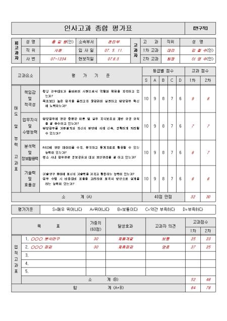 연구직 직원의 인사고과 시 사용할 수 있는 연구직 인사고과 종합 평가표입니다. 피고과자, 고과자, 고과요소, 평가기준, 등급별 점수 등의 항목으로 구성되어있습니다.