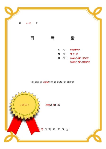 위 사람을 지도강사로 위촉한다는 내용의 지도강사 위촉장 서식입니다, 테두리에 표가 삽입되어 있으며 간단한 샘플을 포함하고 있습니다.