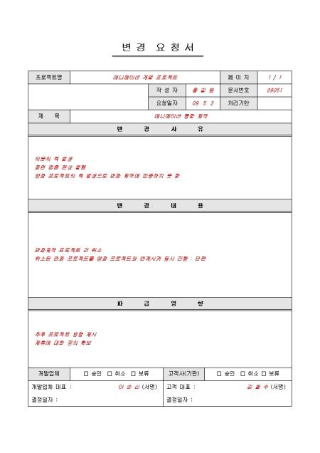 프로젝트 변경을 요청할 때 사용할 수 있는 프로젝트 변경 요청서입니다. 프로젝트명, 변경사유, 변경내역 등의 항목으로 구성되어있습니다.