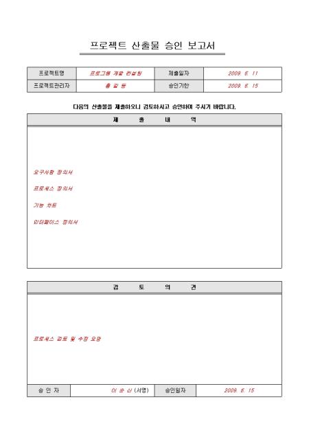 프로젝트 진행에 따른 산출물에 대한 승인을 얻고자 할 때 사용할 수 있는 프로젝트 산출물 승인 보고서입니다. 프로젝트명, 제출일자, 프로젝트관리자, 제출내역 등의 항목으로 구성되어있습니다.