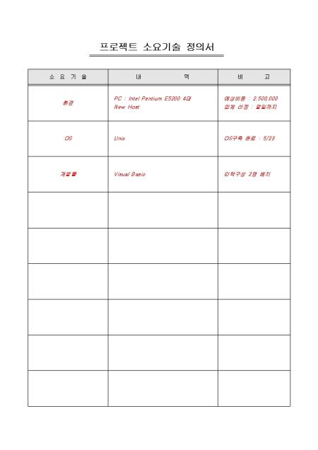 프로젝트 진행 시 소요되는 기술들에 대한 내역을 정의해 놓을 수 있는 프로젝트 소요기술 정의서입니다. 소요기술, 내역, 비고 등의 항목으로 구성되어있습니다.