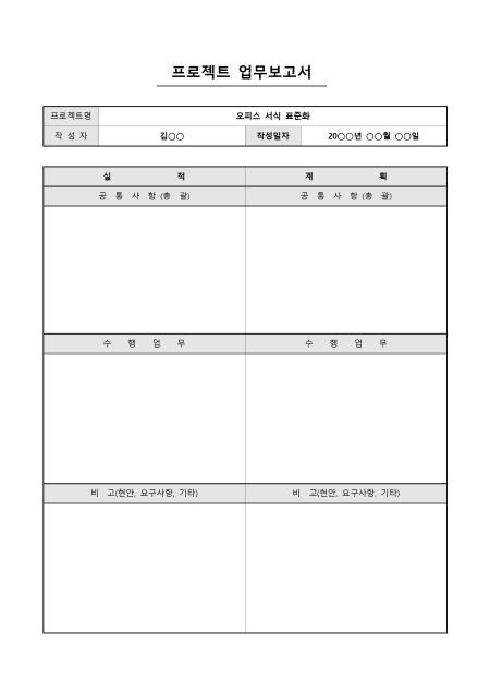 프로젝트에 관한 실적 및 계획을 기록/ 보고할 때 사용할 수 있는 프로젝트 업무보고서입니다. 프로젝트명, 작성자, 실적, 계획 등의 항목으로 구성되어있습니다.