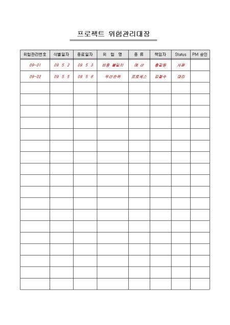 프로젝트 진행에 따른 위험요소를 기록/ 관리할 수 있는 프로젝트 위험관리대장입니다. 위험관리번호, 식별일자, 종료일자, 위험명 등의 항목으로 구성되어있습니다.