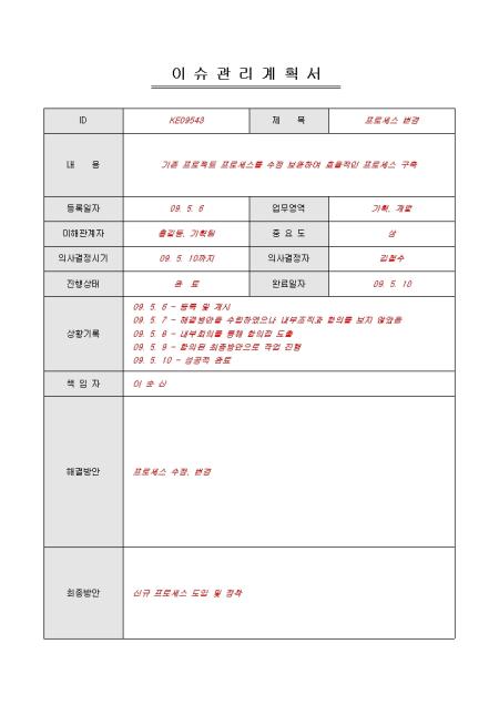 프로젝트 진행 시 나타나는 이슈에 관해 정리하고 계획을 그에 따른 계획을 수립할 때 사용할 수 있는 프로젝트 이슈관리계획서입니다. ID, 제목, 내용, 진행상태, 상황기록 등의 항목으로 구성되어있습니다.