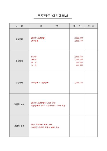 프로젝트에 대한 이익에 대한 내역을 산출할 수 있는 프로젝트 이익계획서입니다. 수익항목, 비용항목, 추정이익 등의 항목으로 구성되어있습니다.