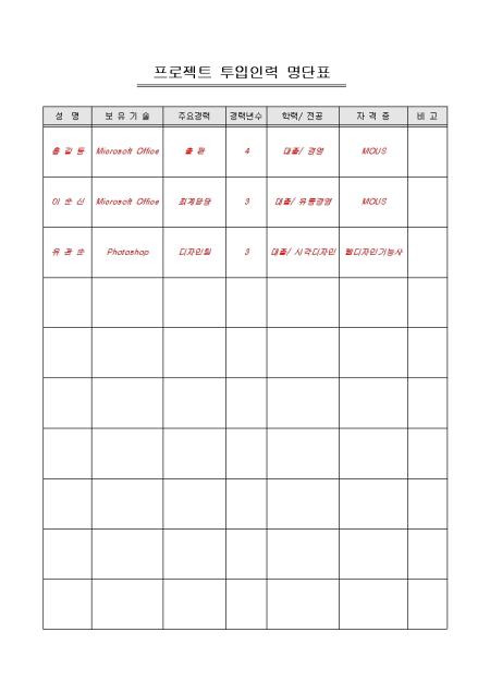 프로젝트에 투입되는 인력에 대한 현황을 기록/ 관리할 수 있는 프로젝트 투입인력 명단표입니다. 성명, 보유기술, 주요경력, 경력년수 등의 항목으로 구성되어있습니다.