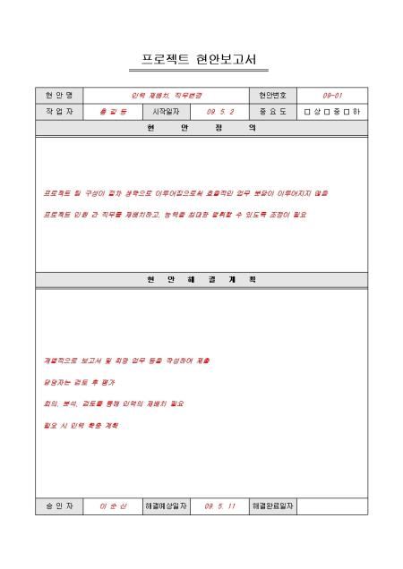 프로젝트에 당면한 현안에 대한 내역을 기록하고 보고할 때 사용할 수 있는 프로젝트 현안보고서입니다. 현안명, 작업자, 중요도, 현안정의 등의 항목으로 구성되어있습니다.