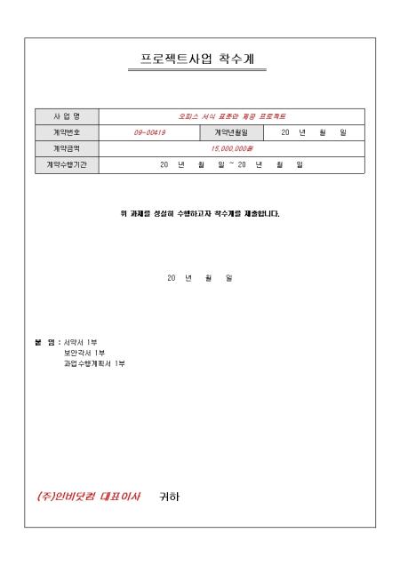 프로젝트 사업 착수를 보고하고 승인을 얻고자 할 때 사용할 수 있는 프로젝트사업 착수계입니다. 사업명, 계약번호, 계약금액, 계약수행기간 등의 항목으로 구성되어있습니다.