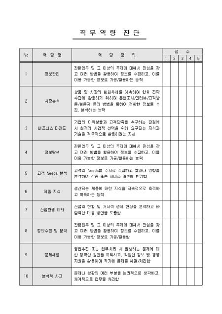 영업직군의 직무역량 진단 시 사용할 수 있는 직무역량 진단지(영업)입니다. 역량명, 역량정의, 점수 등의 항목으로 구성되어있습니다.