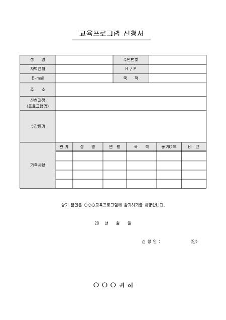 다문화가정을 대상으로 교육 프로그램을 진행할 때 사용할 수 있도록 제작된 교육프로그램 신청서입니다. 성명, 주민번호, 주소, 국적, 신청과정, 수강동기, 가종사항 등의 항목으로 구성되어있습니다.