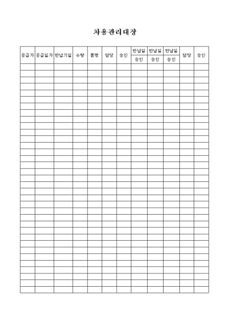 공급자,공급일자,반납기일,수량,품명,반납일을 기록하는 차용관리대장입니다.