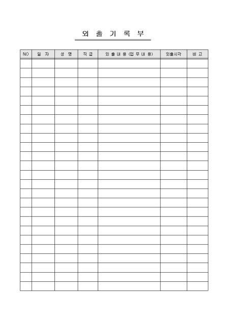 임직원의 외출내역을 기록/ 관리할 수 있도록 제작된 외출기록부입니다. 일자, 성명, 직급, 외출내용, 외출시각 등이 항목으로 구성되어있습니다.