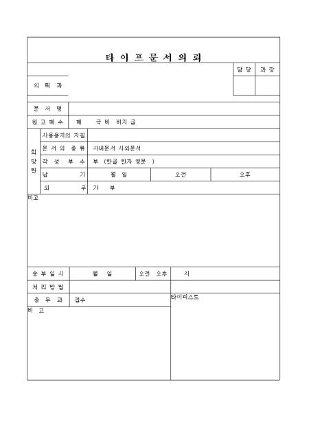 문서명,원고매수,문서의 종류,작성부수,납기일일을 기록하는 타이프문서의뢰서입니다.