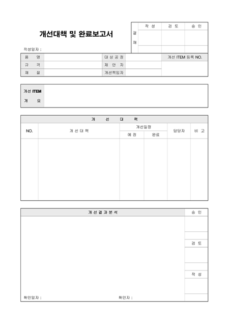 개선 대책 및 완료 내용을 기록하여 보고할 때 사용할 수 있는 개선대책및완료보고서입니다. 개선 ITEM 개요, 개선대책, 개선결과분석 등의 항목으로 구성되어있습니다.