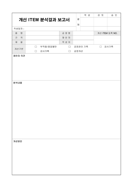 개선ITEM에 대한 분석결과를 기록하여 보고할 때 사용할 수 있는 개선ITEM분석결과보고서입니다. 품명, 공정명, 규격, 제안자, 재질, 작성자, 제안자의견, 분석내용 등의 항목으로 구성되어있습니다.