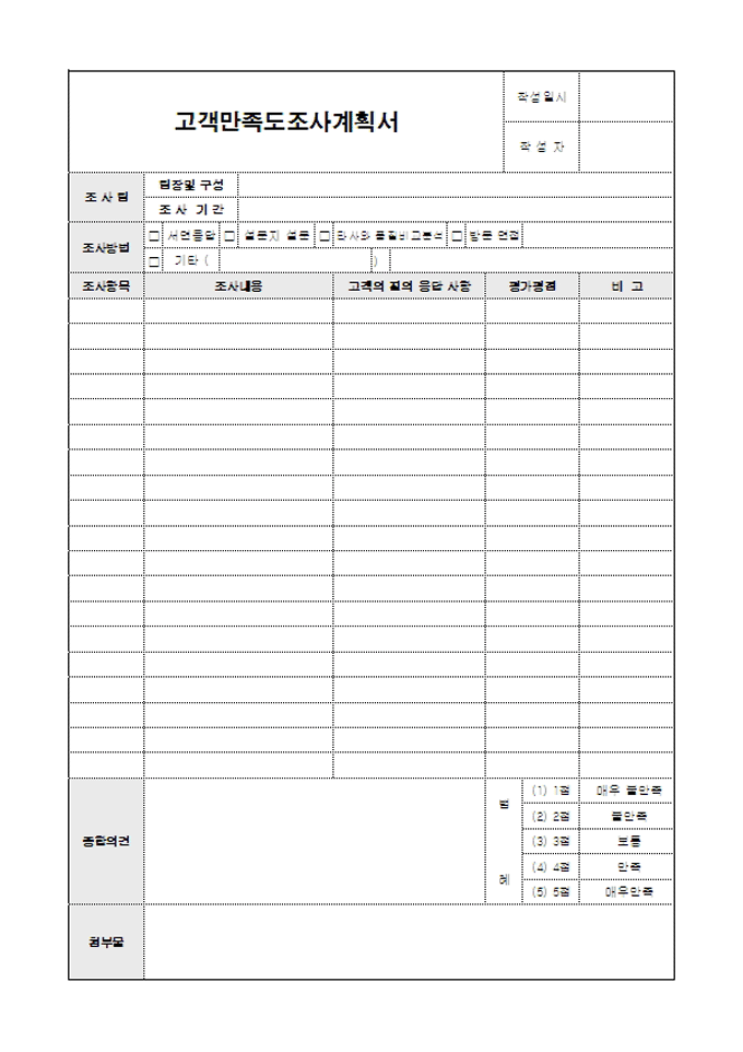 년고객만족도조사에 대한 내역을 계획하여 관리할 때 사용할 수 있는 계획서입니다. 조사팀, 조사방법, 조사항목, 조사내용, 고객의 질의 응답사항, 평가평점 등의 항목으로 구성되어있습니다.