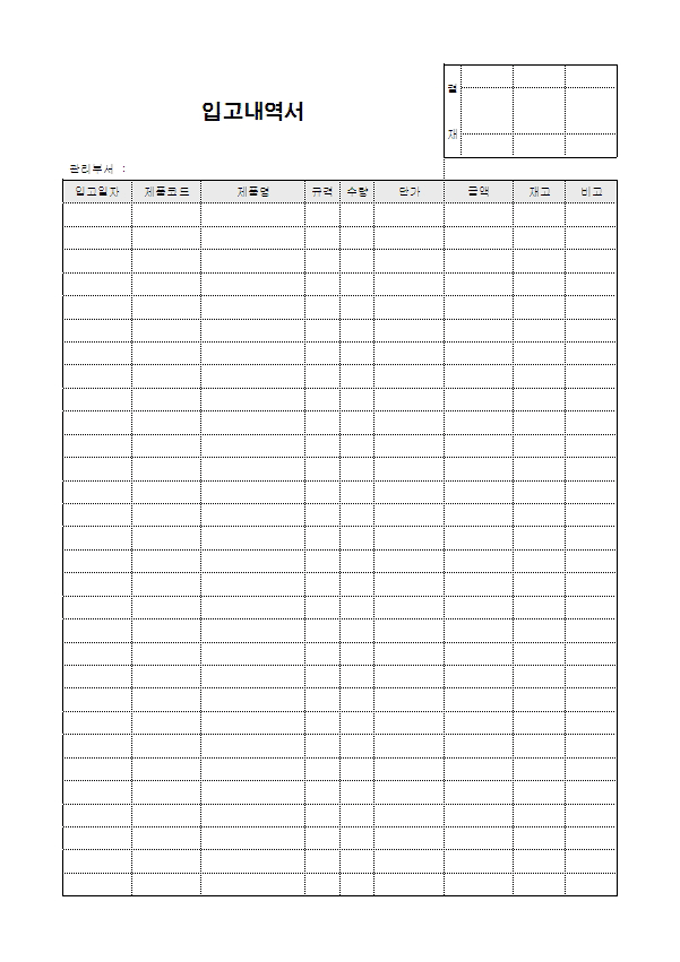 입고에 대한 내역을 기록하여 관리할 때 사용할 수 있는 내역서입니다. 입고일자, 제품코드, 제품명, 규격, 수량, 단가, 금액, 재고 등의 항목으로 구성되어있습니다.