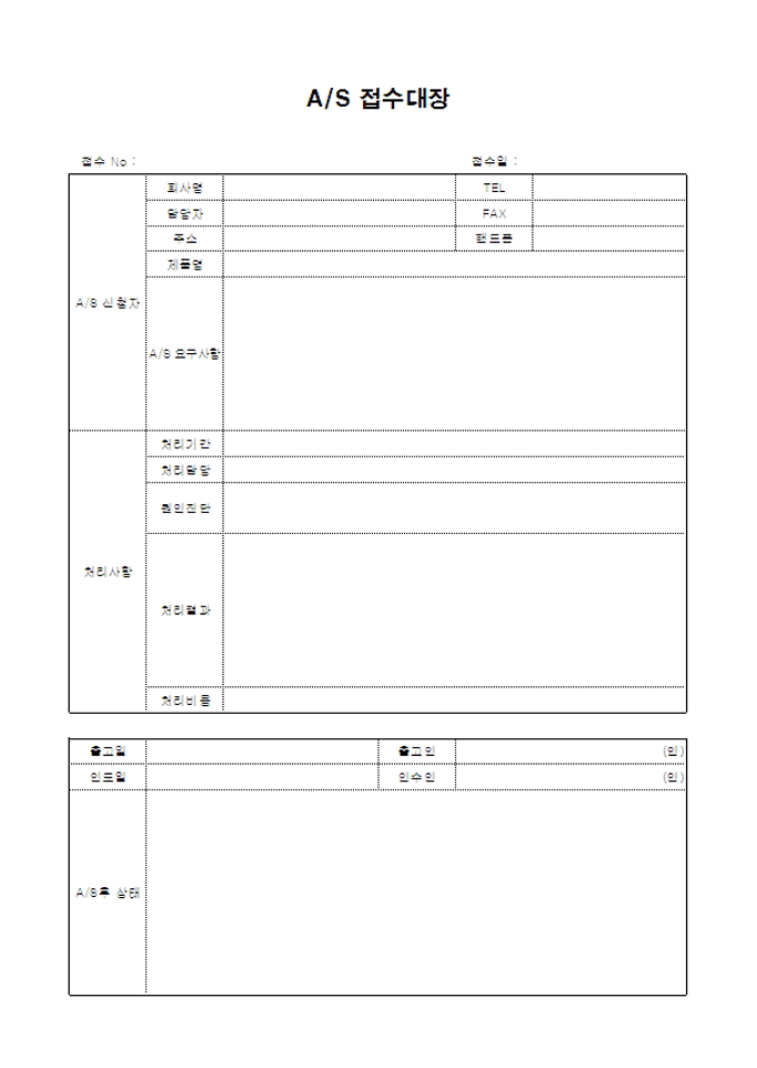 AS접수할 때 사용할 수 있는 접수대장입니다. A/S신청자, 처리사항, 출고일, 인도일, A/S후 상태 등의 항목으로 구성되어있습니다.
