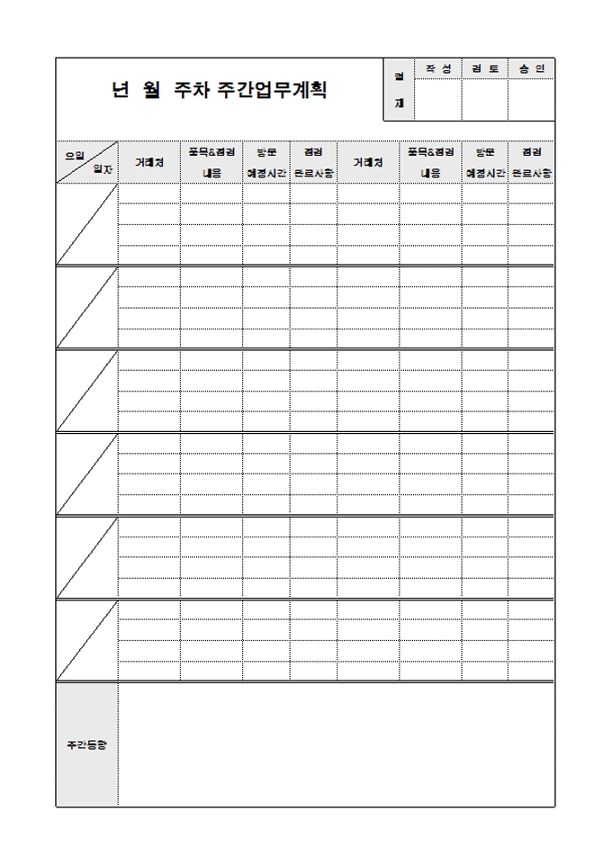 주차 주간업무계획 관리할 때 사용할 수 있는 계획서입니다. 요일, 일자, 거래처, 방문예정시간, 점검 완료사항 등의 항목으로 구성되어있습니다.