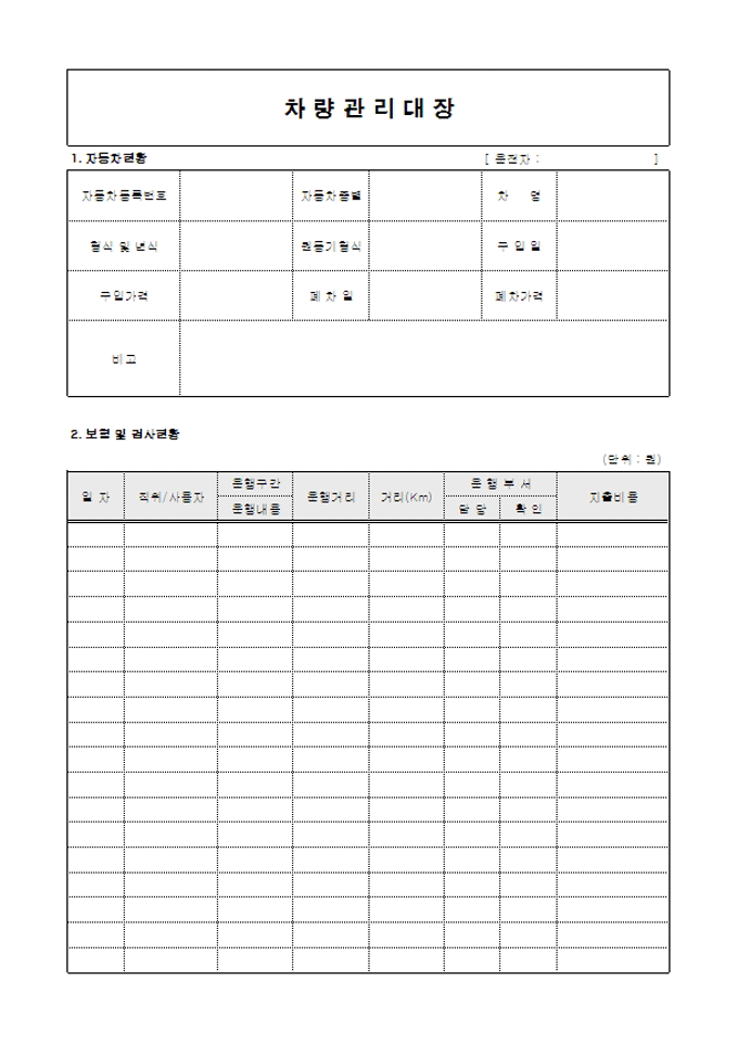 차량 관리할 때 사용할 수 있는 관리대장입니다. 자동차등록번호, 자동차종별, 차명, 일자, 직위/사용자, 운행거리 등의 항목으로 구성되어있습니다.
