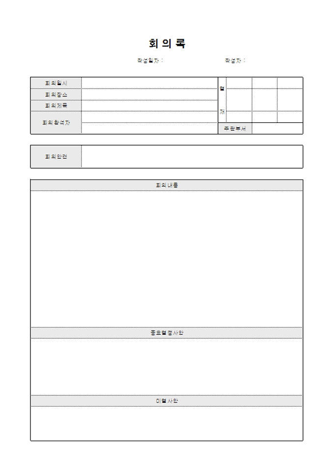 회의 내용을 정리할 때 사용할 수 있는 회의록입니다. 회의일시, 회의장소, 회의제목, 회의참석자, 회의안건, 회의내용 등의 항목으로 구성되어있습니다.