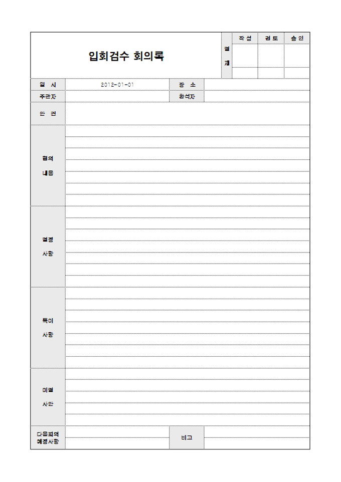 입회검수 회의 내용을 정리할 때 사용할 수 있는 회의록입니다. 장소, 일시, 주관자, 참석자, 안건, 협의내용, 결정사항, 특이사항 등의 항목으로 구성되어있습니다.