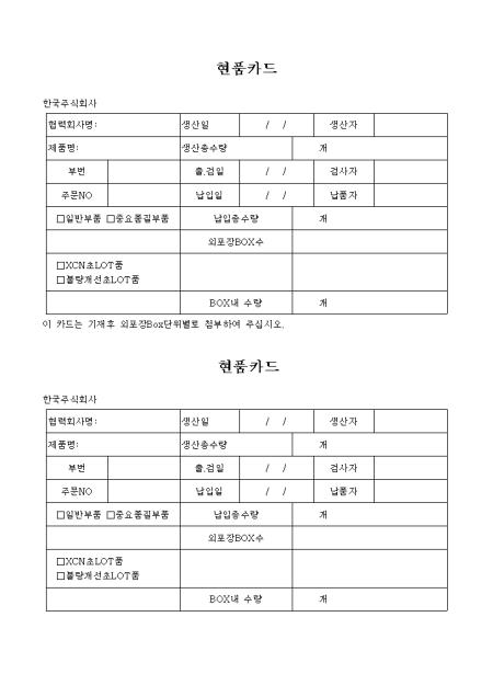 제품명,출검일,납입총수량,검사자,납품자명을 기록하는 현품카드입니다.