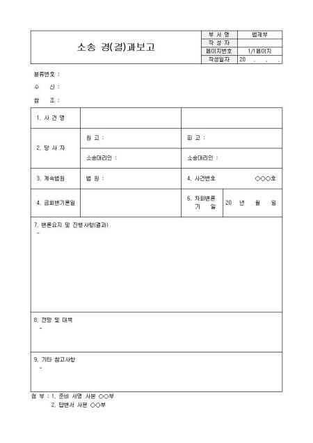 소송 경(결)과보고입니다. 분류변호, 수신, 참조, 사건명, 당사자, 원고, 피고, 소송대리인 등으로 구성되어 있습니다.