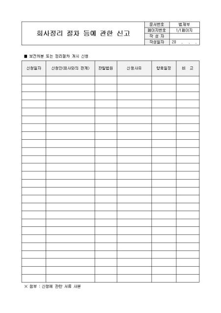 회사정리 절차 등에 관한 신고입니다. 보전처분 또는 정리절차 개시 신청, 신청일자, 신청인 등으로 구성되어 있습니다.