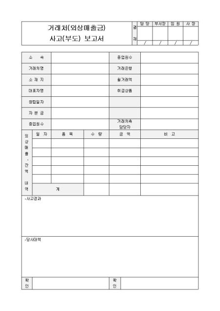 거래처(외상매출금) 사고(부도) 보고서입니다. 소속, 종업원수, 거래처명, 소재지, 거래은행 등으로 구성되어 있습니다.