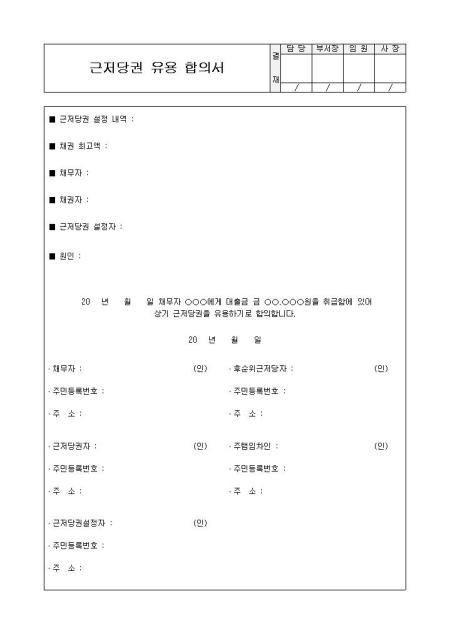 근저당권 설정내역, 채권 최고액, 채무자, 채권자, 근저당권 설정자, 인원 등을 기재하고 합의 내용에 따라 채무자와 근저당권자, 근저당권 설정자, 후순위근저당자, 주택임자인이 모두 서명할수 있도록 제작된 근저당권 유용 합의서 서식입니다.