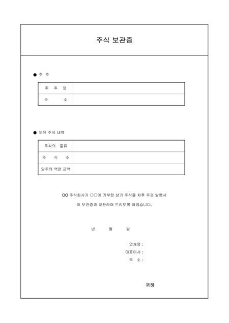 주주명, 주소, 보유 주식의 종류, 주식수, 일주의 액면 금액등을 기재한 후 차후 주권이 발행 되었을때 보관증과 교환해 줄 것을 증명하는 보관증 양식입니다.