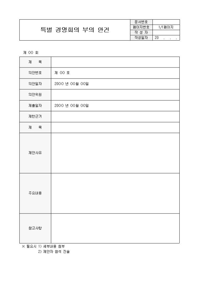 9,000원/월특별 경영회의 부의 안건 서식입니다. 제목, 의안번호, 의안일자, 의안위원, 제출일자 등으로 구성되어 있습니다.