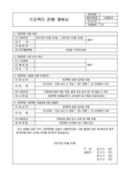 프로젝트 진행 계획서입니다. 프로젝트 진행 계획, 사전 손익 계산, 인센티브, 패널티 등으로 구성되어 있습니다.