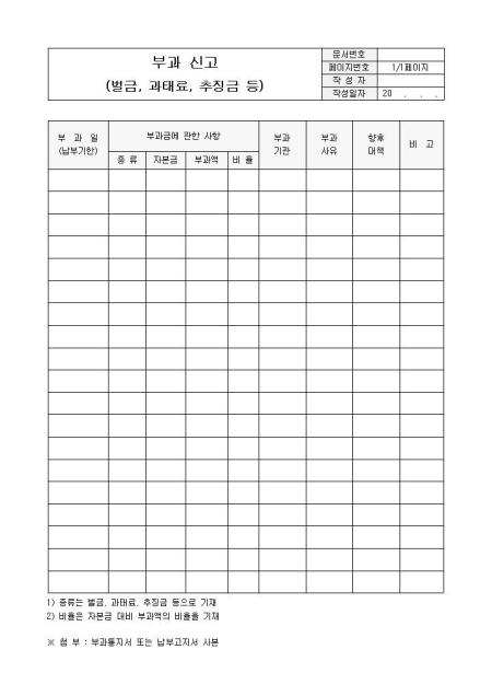 부과신고(벌금, 과태료, 추징금 등)입니다. 부과일, 부과금에 관한 사항, 부과기간, 부과사유 등으로 구성되어 있습니다.
