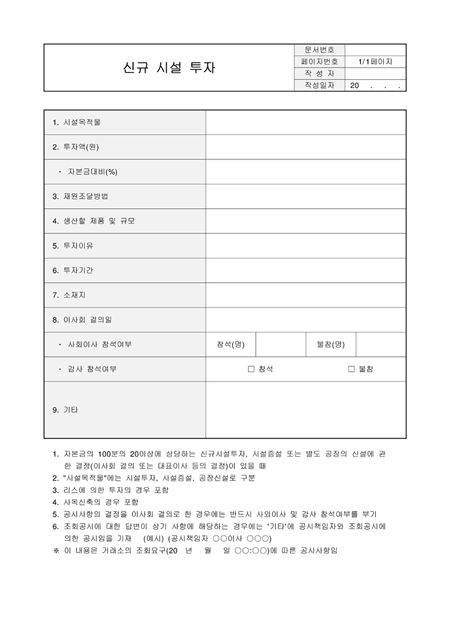 신규 시설 투자서입니다. 시설목적물,투자액,재원조달방법, 생산할 제품 및 규모, 투자이유, 투자기간 등으로 구성되어 있습니다.