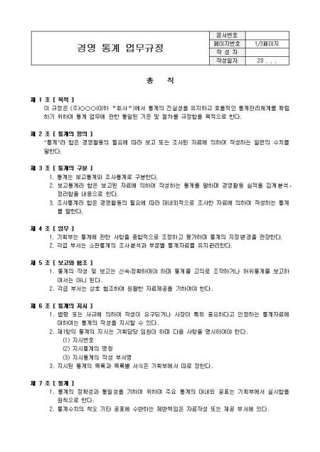 경영 통계 업무규정입니다. 목적, 통계의 정의, 통계의 구분, 임무, 보고와 협조, 통계의 지시, 통계 등으로 구성되어 있습니다.