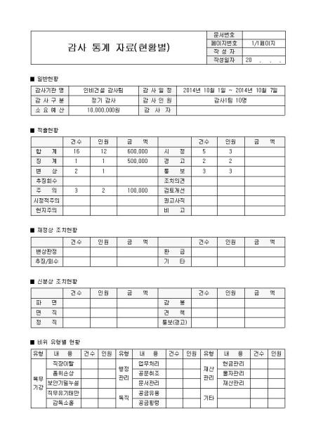 감사 통계 자료(현황별)입니다. 일반 현황, 적출현황, 재정상 조치현황, 신분상 조치현황, 비위 유형별 현황, 감사기관명, 감사일정, 감사구분, 감사인원, 소요예산, 감사자 등으로 구성되어 있습니다.