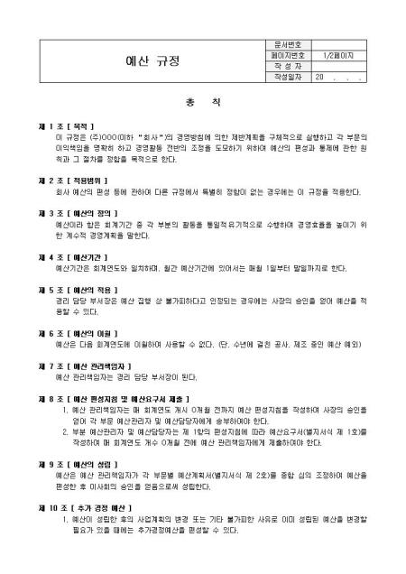 표준 예산 규정입니다. 총칙, 목적, 적용범위, 예산의 정의, 예산기간, 부칙, 예산요구서, 예산계획서, 예산실적보고서 등으로 구성되어 있습니다.