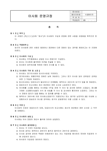 이사회 운영규정입니다. 목적, 적용범위, 이사회의 구성, 이사회의 구분 및 소집, 의장, 이사회의 성립, 이사회의 결의방법, 이사회 의결사항, 이사 아닌 자의 출석, 이사회 장소 등으로 구성되어 있습니다.