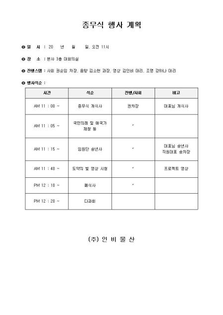 종무식 행사를 위한 일정이나, 진행자 안내와 함께 시간대별 식순과 상세 내용을 기록할 수 있는 종무식 행사 계획 서식입니다.