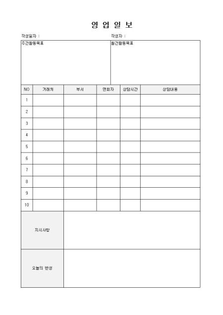 신입사원용으로 제작된 영업일보 서식으로 주간 활동목표, 월간 활동목표를 상단에 기록하고 고객상담내용을 기록, 상사의 지시사항 및 하루의 반성 등을 작성할 수 있도록 제작되었습니다.