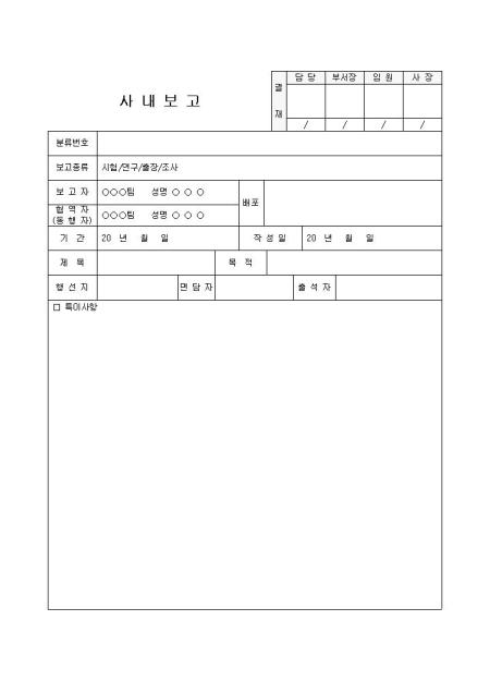 사내보고(간단양식)입니다. 분류번호, 보고종류, 보고자, 협역자, 배포, 기간 등의 항목으로 구성되어 있습니다.