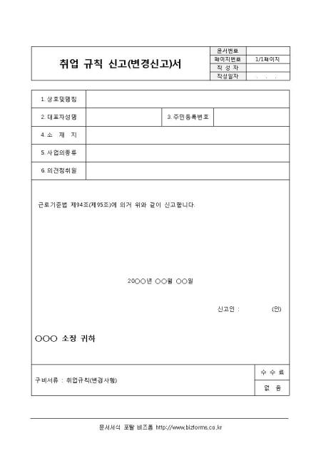 취업 규칙 신고(변경신고)서 입니다. 상호 및 명칭 대표자 성명, 소재지, 사업의 종류, 의견청취일 등으로 구성되어 있습니다.