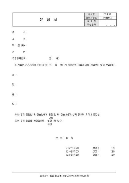 감사문답서입니다. 주소, 소속, 직급, 성명, 문답형식으로 구성되어있습니다.
