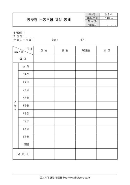 공무원 노동조합 가입 통계입니다. 기관명, 등급, 정원, 현원, 가입인원등의 항목으로 구성되어 있습니다.