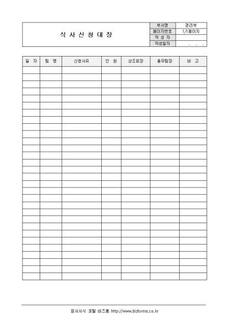 식사신청대장입니다. 일자, 팀명, 신청사유 인원등의 항목으로 구성되어 있습니다.