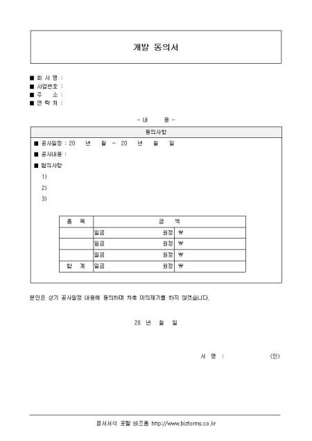 개발동의서입니다. 회사명,사업번호,주소, 공사일정,공사내용,협의사항의 항목으로 구성되어있습니다.