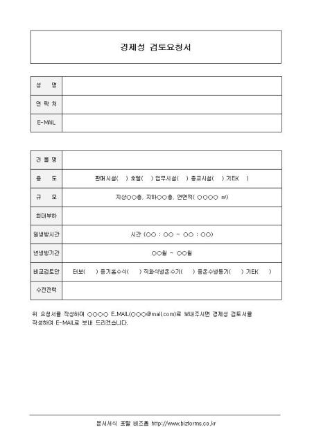 경제성검토요청서입니다. 건물명, 용도, 규모, 최대부하, 일냉방시간, 년냉방기간등의 항목으로 구성되어있습니다.