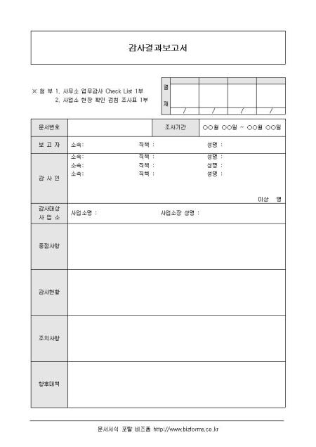 감사결과보고서입니다. 주로 기획실에서 많이 쓰이며 감사 결과에 대한 보고서를 작성할 수 있으며 감사인, 보고자, 중점사항 조치사항 등으로 이루어져 있습니다.